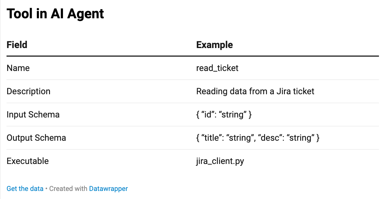 Let’s imagine we want to query Jira Issue Tracker for the content of a certain ticket. First, we need to create a script which sends an API request to Jira. Then we need to understand what parameters we pass into the script, and what we get back. That’s schema. And finally the tool should have a name and description to be useful for our LLM.