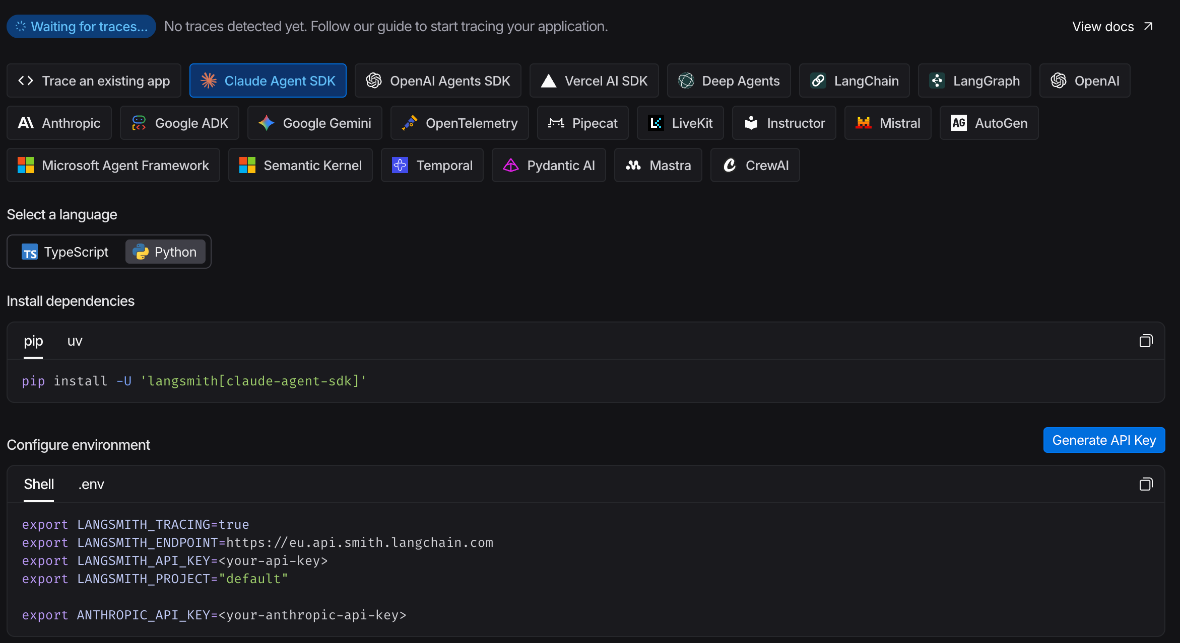 Configuring the agent can be as easy as providing the required environment variables if using a dedicated observability solution like LangSmith. Find the setup instructions there.