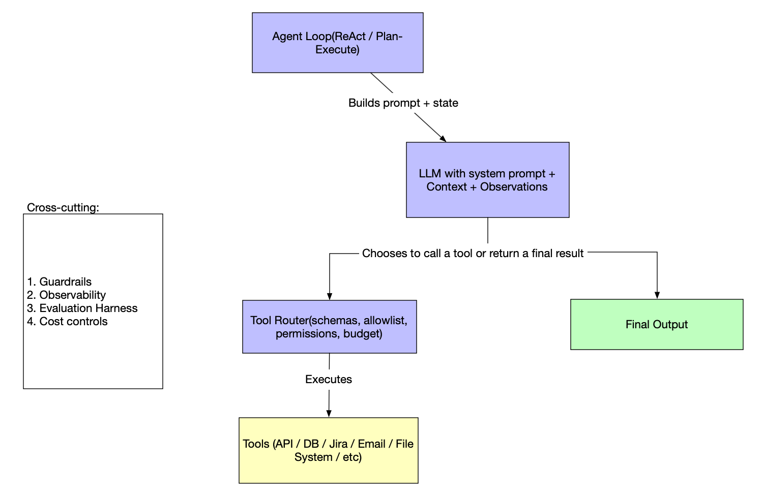 An AI agent is not magic — it is a loop. An LLM decides what to do next; the execution environment carries out the decision, updates state, and feeds the result back. Repeat until done.